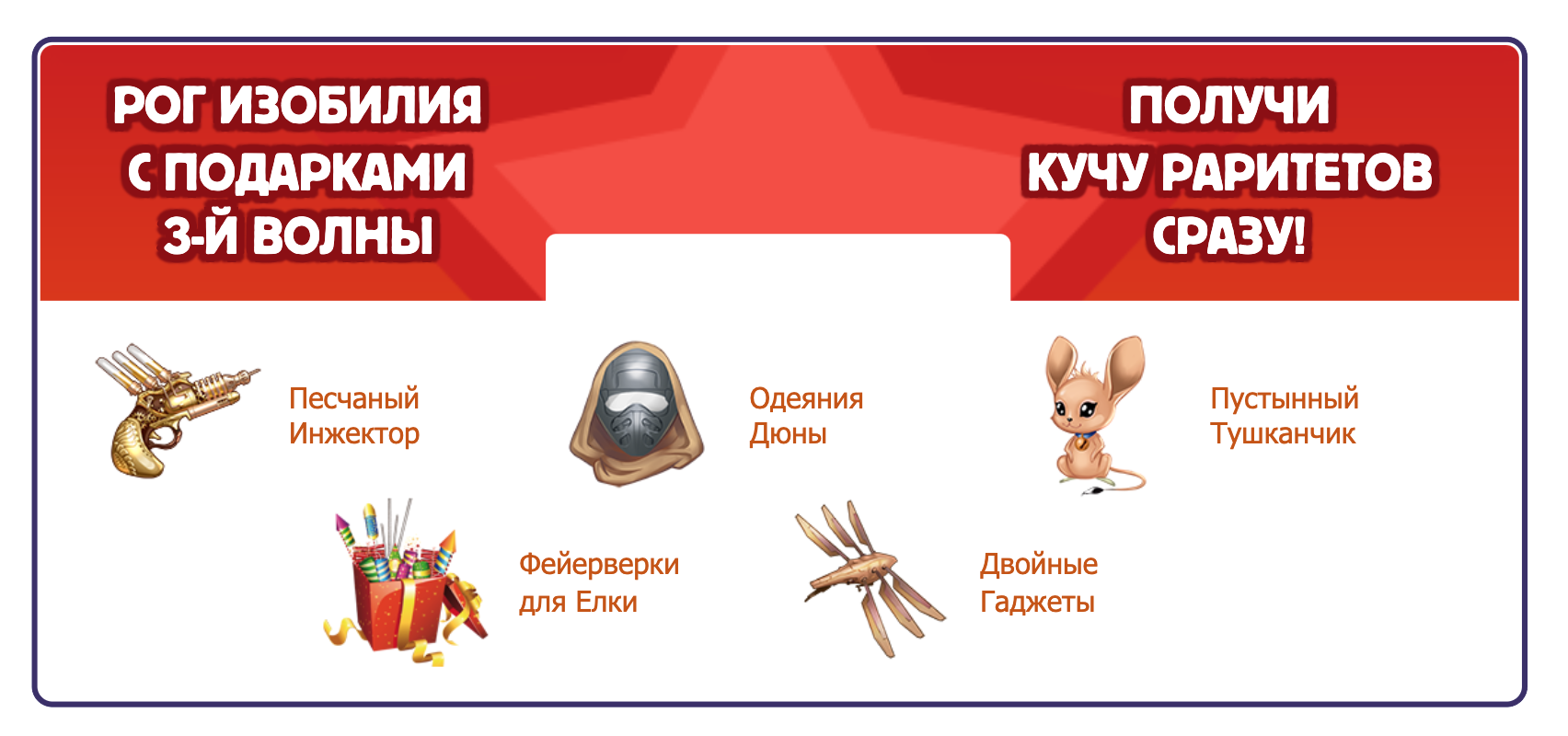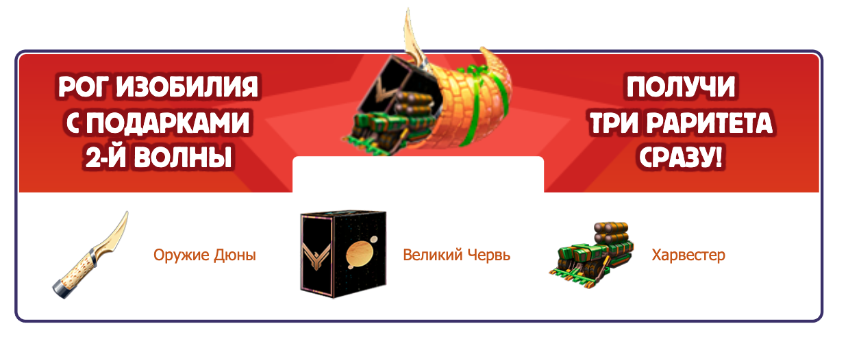 Рог изобилия — это предмет, который содержит в себе все раритеты текущей волны подарков сразу в максимальной модификации и является желанным призом для любого игрока!