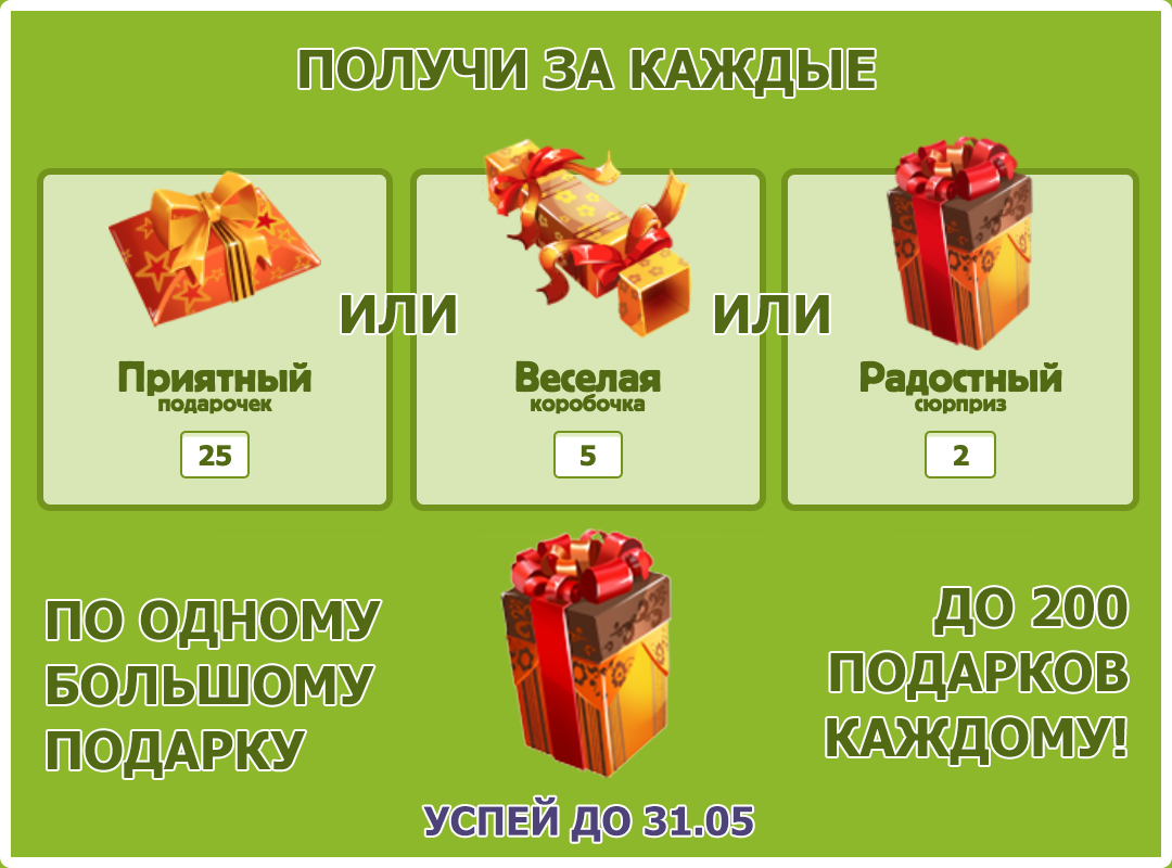 За небольшой взнос вы получите по 1 большому подарку за каждые 25 маленьких, 5 средних или 2 больших презента, уже подаренных во время второго этапа! Чем больше подарков уже куплено, тем больше бонус — вплоть до максимального размера в 200 больших подарков второго этапа. Торопись, предложение разовое и будет доступно только до 31.05!