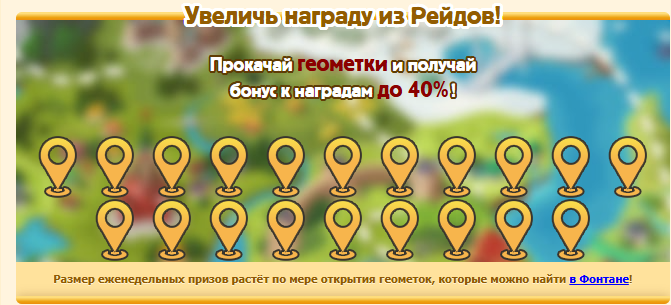 Достань из фонтана 20 геометок, чтобы значительно увеличить награду в Еженедельных Рейдах! Увеличь еженедельную награду в патриотизме и супер-характеристиках на 40%, и даже начни получать долги!