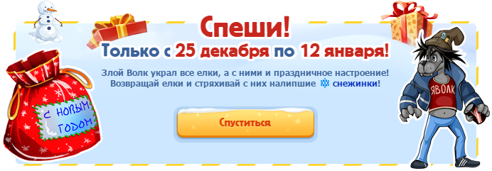 Выиграй в рулетку новогодние обновки! Это не обычные шмотки, а улучшениеNEW для ваших текущих вещей. Меняя одетую на вас вещь, вы выбираете, какая будет улучшена при открытии коробки нужного типа. Собрав все коробки, вы сможете получить +7% ко всем вашим характеристикам на каждую из шмоток: шапку, одежду и обувь, и вдобавок особые бонусы за полный комплект!